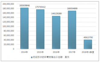 2016年我國(guó)初級(jí)形狀的環(huán)氧樹脂出口總額146129289美元,2017年出口總額169354899美元;2018年1季度出口總額40613700美元。