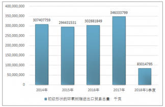 2016年我國初級形狀的環(huán)氧樹脂進出口貿(mào)易總量302881849千克,2017年進出口貿(mào)易總量346333799千克;2018年1季度進出口貿(mào)易總量83014795千克。