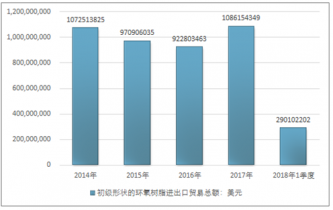 2016年我國初級形狀的環(huán)氧樹脂進出口貿(mào)易總額922803463美元,2017年進出口貿(mào)易總額1086154349美元;2018年1季度進出口貿(mào)易總額290102202美元。