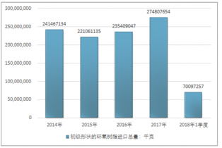 2016年我國初級形狀的環(huán)氧樹脂進口總量235409047千克,2017年進口總量274807654千克;2018年1季度進口總量70097257千克。