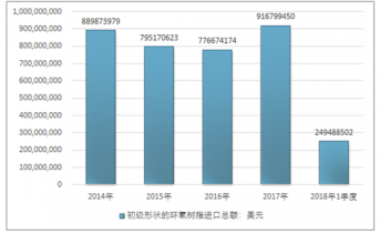 2016年我國初級形狀的環(huán)氧樹脂進口總額776674174美元,2017年進口總額916799450美元;2018年1季度進口總額249488502美元。