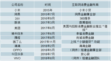 2015-2018年部分巨頭公司互聯(lián)網(wǎng)消費金融業(yè)務布局整理