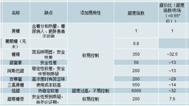 與營(yíng)養(yǎng)性甜味劑相比,非營(yíng)養(yǎng)型的甜味劑甜度較高,且人工合成的非營(yíng)養(yǎng)型甜味劑的甜價(jià)比(甜價(jià)比=甜度/市場(chǎng)價(jià)*0.65)優(yōu)勢(shì)最為突出(表 2)。 由于天然甜味劑均提取于天然植物,原料來源有一定限制而且提取技術(shù)實(shí)現(xiàn)相對(duì)較晚,目前絕對(duì)市場(chǎng)價(jià)格偏高,性價(jià)比不高。人工甜味劑的技術(shù)更為成熟,市場(chǎng)價(jià)格較為合理。目前來看,在人工甜味劑中,安賽蜜與紐甜的甜價(jià)比相對(duì)較高,其中安賽蜜的添加易用性要優(yōu)于紐甜,預(yù)計(jì)價(jià)格還有上行的空間。