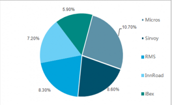 尚未出現(xiàn)絕對(duì)龍頭。雖然整體來(lái)看,行業(yè)集中度較高,但具體來(lái)看,市場(chǎng)占有率第.一的Micros只擁有10.7%的市場(chǎng)份額(843家網(wǎng)站關(guān)聯(lián)了Micros的PMS),市占率超過(guò)5%的廠商有7家。目前,排名前八位的廠商市場(chǎng)份額差別不大,行業(yè)尚未出現(xiàn)絕對(duì)龍頭。