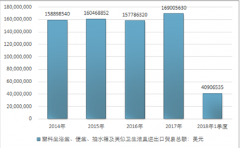 2016年我國塑料坐浴盆、便盆、抽水箱及類似衛(wèi)生潔具進(jìn)出口貿(mào)易總額157786320美元,2017年進(jìn)出口貿(mào)易總額169005630美元;2018年1季度進(jìn)出口貿(mào)易總額40906535美元。