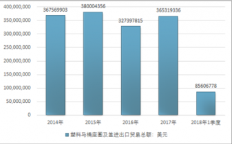 2016年我國塑料馬桶座圈及蓋進出口貿易總額327397815美元,2017年進出口貿易總額365319336美元;2018年1季度進出口貿易總額85606778美元。