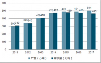 2011-2017年我國農藥中間體產量和需求量情況圖