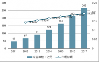 2011-2017年我國專業(yè)健康體檢市場規(guī)模及份額走勢圖