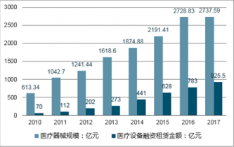 中國(guó)醫(yī)療設(shè)備行業(yè)市場(chǎng)規(guī)模從2010年的613.34億元增長(zhǎng)至2017年的2737.59億元,其中2017年我國(guó)醫(yī)療設(shè)備融資租賃規(guī)模為925.5億元,占比33.81%。