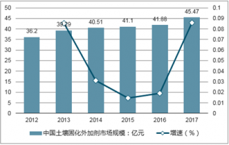 根據(jù)數(shù)據(jù)顯示,2017年我國土壤固化外加劑市場規(guī)模為45.47億元,較2016年的41.88億元增長8.57%。