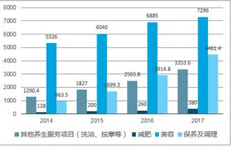 在養(yǎng)生館類(lèi)別中,美容服務(wù)養(yǎng)生館規(guī)模最大,約7296億元,養(yǎng)生及調(diào)理市場(chǎng)規(guī)模約4461.4億元,減肥約380億元,其他養(yǎng)生服務(wù)(洗浴、按摩)規(guī)模3353.6億元。
