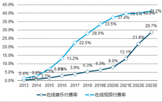2013-2023年中國在線音樂服務付費率與中國在線視頻付費率圖