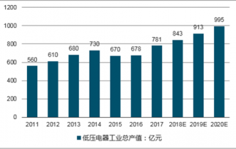 2017年我國低壓電器工業總產值已經達到781億元。根據中電聯預測,我國2019年電力消費量增速約為5.5%,假設2018-2020年間電力消費量增速依次為5.5%/6%/7%,則根據擬合公式,2018-2020年低壓電器工業總產值增速依次為7.93%/8.29%/9.01%,低壓電器工業總產值依次為843/913/995億元。