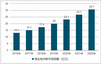 隨著產(chǎn)業(yè)技術(shù)水平的進(jìn)步以及下游應(yīng)用市場的擴(kuò)展,預(yù)計到2022年我國微生物診斷試劑市場規(guī)模將達(dá)到30.7億元,未來幾年行業(yè)規(guī)模年均增速在15%左右。