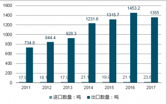 2017年我國(guó)假牙進(jìn)口數(shù)量為23.63噸,進(jìn)口數(shù)量同比增長(zhǎng)11.92%;2017年我國(guó)假牙出口數(shù)量為1355.01噸,出口數(shù)量同比下降6.76%。