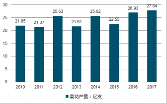 2016年我國國內(nèi)菊花產(chǎn)量為26.93億支,2017年我國菊花產(chǎn)量為27.84億只,產(chǎn)量同比增長3.37%。與世界水平比較,中國的菊花產(chǎn)業(yè)發(fā)展總體處于花卉業(yè)低端,種植面積廣闊,單位面積產(chǎn)值低,國內(nèi)市場有待發(fā)掘。經(jīng)濟發(fā)展與花卉產(chǎn)業(yè)消費密切相關(guān),我國花卉產(chǎn)業(yè)發(fā)展緩慢,人均花費較低。在菊花全產(chǎn)業(yè)鏈端看,菊花育種方面緩慢積累,單位面積產(chǎn)出低,技術(shù)落后,科技參與度低。終端服務零售從業(yè)者素質(zhì)較低,專業(yè)出身比例非常低,大多依靠半路轉(zhuǎn)行的熱情從業(yè)者。