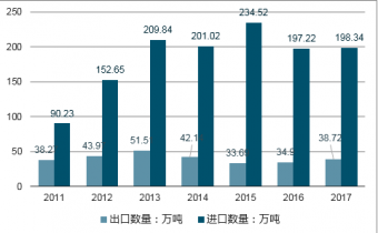 2011-2017年中國棉紗線(非供零售用、縫紉線除外)出口數量分析