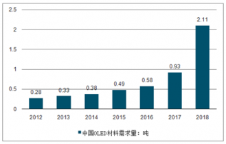 OLED的快速發展將帶動整個OLED產業鏈的快速擴張,包括制造設備、材料、組裝等產業鏈都將孕育巨大的機遇,隨著OLED面板被各大廠商應用在最新款的電子產品上,OLED產業鏈的上游功能材料也受到相應的需求刺激呈現出爆發式的增長。2012年我國OLED材料需求量約0.28噸,到2017年達到了0.93噸,2018年國內OLED材料需求量約2.11噸。預計到2020年我國OLED材料需求量將達到10噸,未來幾年國內OLED材料需求將迅猛增長。