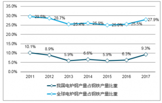 國內外電爐鋼(電弧爐和感應爐)產量占煉鋼總量比重對比