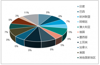 2019年主要的肉牛存欄量國(guó)家中,印度全球肉牛存欄量數(shù)據(jù)最高,占比高達(dá)30%,巴西第二,占比23%,以后依次為歐盟、阿根廷、澳大利亞。