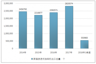 2016年我國(guó)蒸餾滲濾式咖啡機(jī)出口總量2392571個(gè),2017年出口總量2820574個(gè);2018年1季度出口總量550983個(gè)。