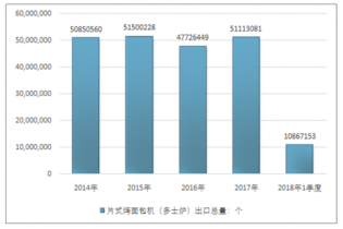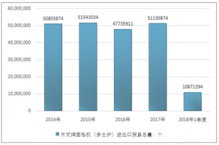 2016年我國片式烤面包機(多士爐)進出口貿易總量47735911個,2017年進出口貿易總量51130874個;2018年1季度進出口貿易總量10871394個。