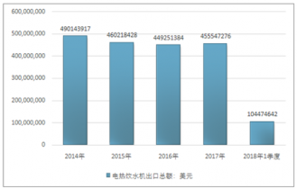 2016年我國(guó)電熱飲水機(jī)出口總額449251384美元,2017年出口總額455547276美元;2018年1季度出口總額104474642美元。