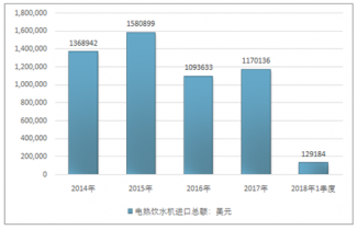 2016年我國(guó)電熱飲水機(jī)進(jìn)口總額1093633美元,2017年進(jìn)口總額1170136美元;2018年1季度進(jìn)口總額129184美元。