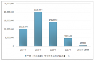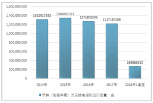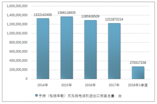 2016年我國手持(包括車載)式無線電話機進出口貿易總量1285928509臺,2017年進出口貿易總量1221873214臺;2018年1季度進出口貿易總量270317236臺。