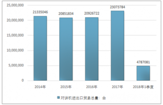 2016年我國對講機進出口貿(mào)易總額552753545美元,2017年進出口貿(mào)易總額611960659美元;2018年1季度進出口貿(mào)易總額166165911美元。