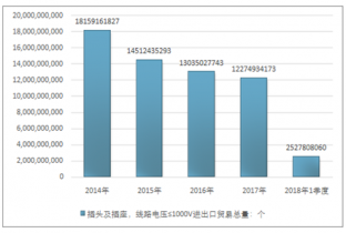 2016年我國插頭及插座,線路電壓≤1000V進出口貿易總量13035027743個,2017年進出口貿易總量12274934173個;2018年1季度進出口貿易總量2527808060個。