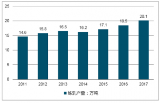 國外大型食品企業(yè)在我國投資建廠的外資乳品企業(yè)由于缺少奶源的支持并受到消費渠道的影響,在2000年后紛紛退出了中國市場。從2005年開始,雀巢、荷蘭皇家菲仕蘭公司等境外公司紛紛進入國內(nèi)乳制品制造行業(yè),這無疑加劇了乳制品市場的競爭。同時,國內(nèi)大型乳品企業(yè)也將在與外資企業(yè)的競爭和合作中提升自身的技術(shù)管理水平,借助外資開拓國際市場,實現(xiàn)品牌國際化。近年來,國內(nèi)煉乳行業(yè)產(chǎn)量穩(wěn)步增長,從2011年的14.6萬噸增長到2017年的20.1萬噸。
