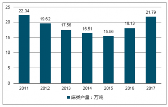 隨著種植面積的降低,我國(guó)麻類作物產(chǎn)量也一直處于下降區(qū)間過程中,2015年我國(guó)的麻類作物產(chǎn)量?jī)H為15.56萬噸,2017年我國(guó)麻類產(chǎn)量回升至21.79萬噸。
