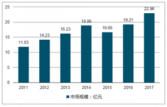2017年國內碳酸二甲酯市場規模達到了22.96億元,同比2016年的19.21億元增長了19.52%,近幾年我國碳酸二甲酯市場規模情況如下圖所示: