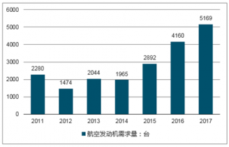 2011年我國航空發動機市場需求規模為46.61億元,民用航空發動機市場需求規模為119.86億元,2017年我國航空發動機市場需求規模為127.82億元,民用航空發動機市場需求規模為328.68億元。