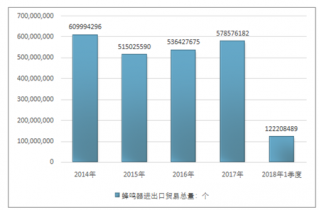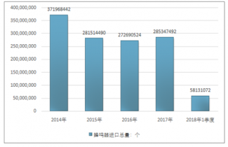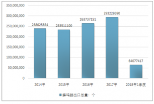 2016年我國蜂鳴器進出口貿易總量536427675個,2017年進出口貿易總量578576182個;2018年1季度進出口貿易總量122208489個。