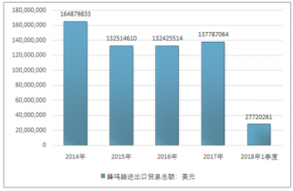 2016年我國蜂鳴器進出口貿易總額132425514美元,2017年進出口貿易總額137787064美元;2018年1季度進出口貿易總額27720261美元。