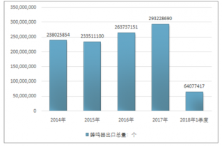 2016年我國蜂鳴器出口總量263737151個,2017年出口總量293228690個;2018年1季度出口總量64077417個。