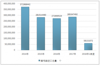 2016年我國蜂鳴器進口總量272690524個,2017年進口總量285347492個;2018年1季度進口總量58131072個。