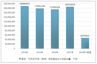 2016年我國固定、可變或可調(diào)(微調(diào))電容器進(jìn)出口貿(mào)易總量173581618千克,2017年進(jìn)出口貿(mào)易總量185200042千克;2018年1季度進(jìn)出口貿(mào)易總量46405501千克。