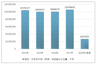 2016年我國固定、可變或可調(diào)(微調(diào))電容器出口總量99998279千克,2017年出口總量105308626千克;2018年1季度出口總量26337824千克。