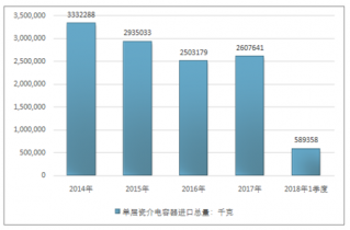 2016年我國單層瓷介電容器出口總量2107650千克,2017年出口總量2494088千克;2018年1季度出口總量562728千克。