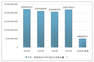 2016年我國開關,線路電壓≤1000V進出口貿易總量20548585244個,2017年進出口貿易總量21827709727個;2018年1季度進出口貿易總量4988185417個。