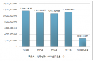 2016年我國開關,線路電壓≤1000V進口總量10761050077個,2017年進口總量11276341680個;2018年1季度進口總量2620191002個。