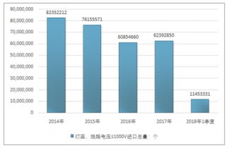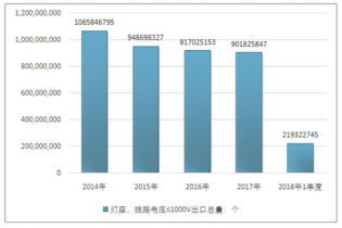 2016年我國(guó)燈座,線路電壓≤1000V出口總量917025153個(gè),2017年出口總量901825847個(gè);2018年1季度出口總量219322745個(gè)。