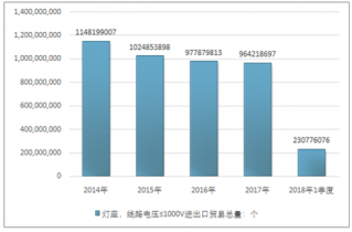 2016年我國(guó)燈座,線路電壓≤1000V進(jìn)出口貿(mào)易總量977879813個(gè),2017年進(jìn)出口貿(mào)易總量964218697個(gè);2018年1季度進(jìn)出口貿(mào)易總量230776076個(gè)。