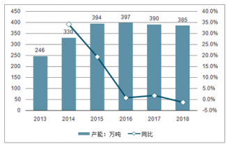 2018年我國丙烯酸脂產能為385萬噸,同比2017年的390萬噸降低了1.28%。