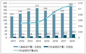 2011-2018年中國CVD金剛石產量及占比人造鉆石比重情況