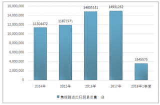 2016年我國集線器進(jìn)出口貿(mào)易總量14805531臺,2017年進(jìn)出口貿(mào)易總量14931262臺;2018年1季度進(jìn)出口貿(mào)易總量3545575臺。