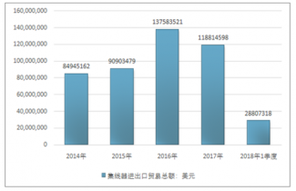 2016年我國集線器進出口貿(mào)易總額137583521美元,2017年進出口貿(mào)易總額118814598美元;2018年1季度進出口貿(mào)易總額28807318美元。